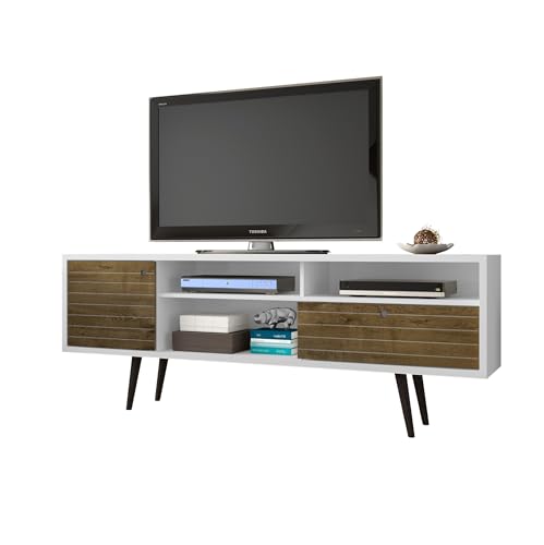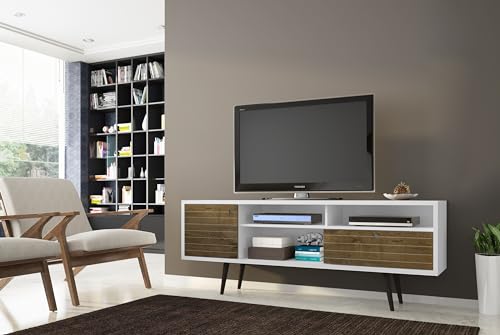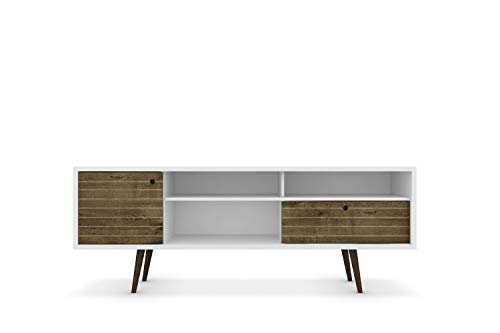 Manhattan Comfort - حامل التلفزيون ميد سنشري موديرن من مجموعة لايبرتي كوليكشن من مانهاتن كومفورت بثلاثة أرفف وخزانة ودرج بأرجل مفلطحة، أبيض/خشبي