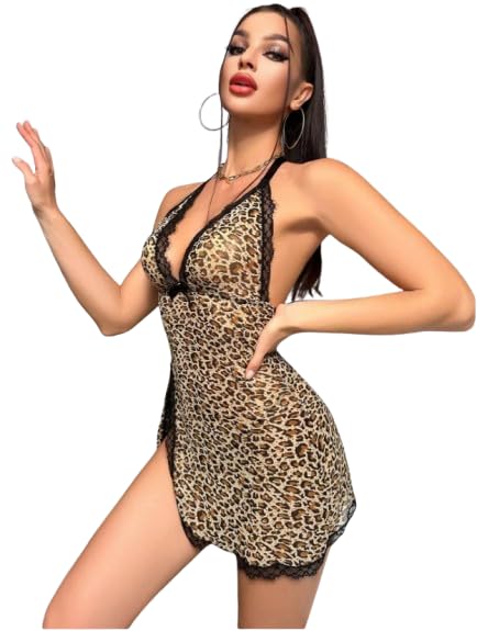 Generic - MANIKAN Leopard Print Lace Trim Slip Dress, Halter Neckline, Thigh-High Slit, one size