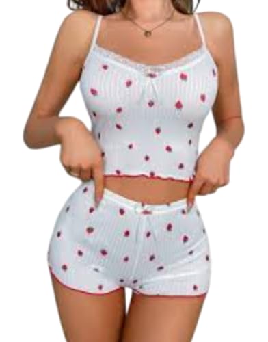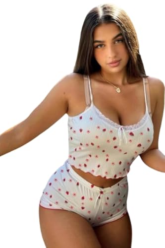 Generic - طقم بحمالات رفيعة وشورت عالي الخصر بطبعة زهور من الليكرا للنساء من مانيكان، ابيض مع زهور وردية