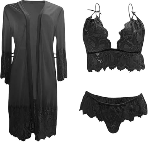 Generic - ملابس لانجري للنساء من مانيكان، حمالة صدر مثيرة من الدانتيل الشفاف ورداء مصنوع من قماش الليكرا الناعم مع بلوزة دانتيل وبانتي بيبي دول من خامة ناعمة