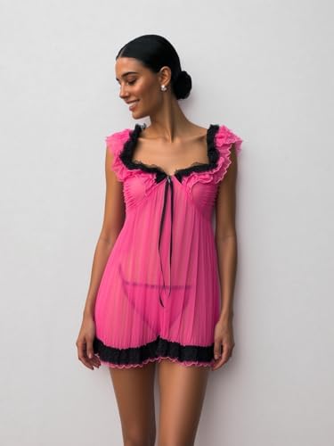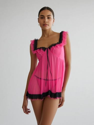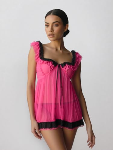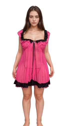 Generic - MANIKAN Women's Lingerie Sheer Babydoll Nightgown Hot Pink with Black Lace Trim Empire Waist Mini Length