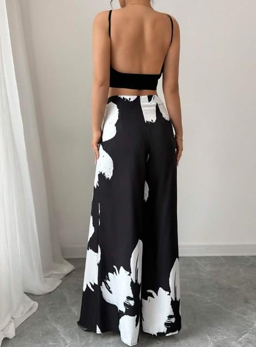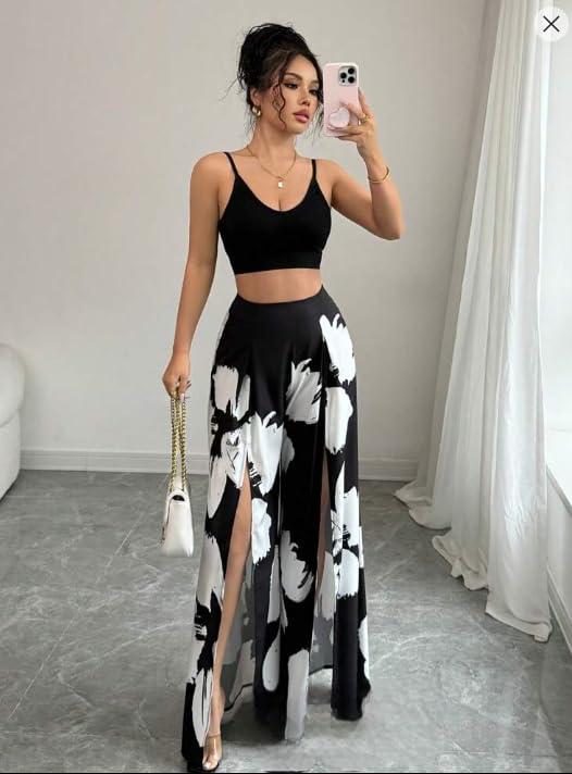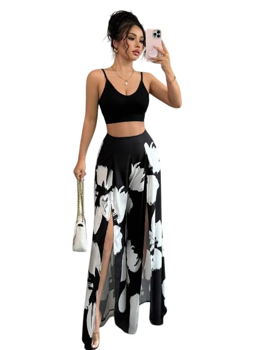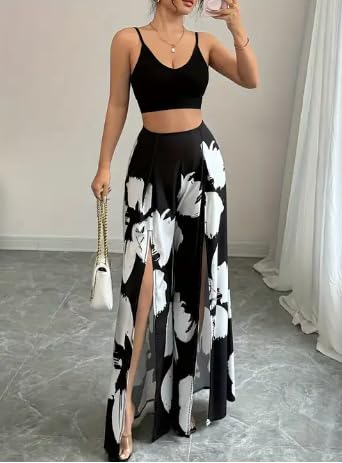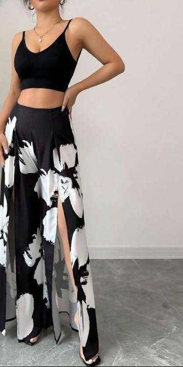 Generic - MANIKAN Women's Lingerie Women's Two-Piece Outfit Set Black Crop Top with High Waist Floral Print Maxi Skirt and Palazzo Pants