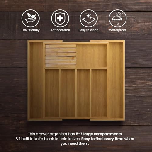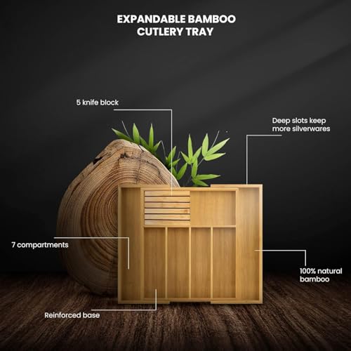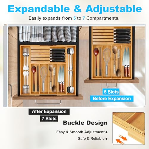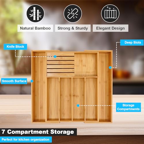 MantraRaj - منظم أدوات مائدة، صينية أدوات تناول طعام من البامبو للأدراج، 7 مساحات تخزين، رف حامل لأدوات المادة والسكاكين قابل للتمدد من الخشب من مانتراج
