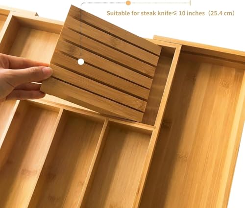- حافظ على ترتيب أدوات المطبخ الخاصة بك وإخفائها بشكل أنيق داخل الدرج مع منظّم أدوات المائدة المصنوع من البامبو من مانتراج. يحتوي منظم الأدراج هذا على 5 إلى 7 مساحات تخزين كبيرة بالإضافة إلى حامل سكاكين مدمج لتخزين السكاكين بأمان. ستجدها بسهولة في كل مرة تحتاج فيها إلى استخدامها. يعد المنظم المصنوع من البامبو أفضل وسيلة للحفاظ على ترتيب أدوات المطبخ من خلال تنظيمها داخل الدرج.