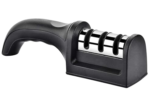 generic - مسن سكاكين يدوي 3 في 1، فتحات سن خشنة ومتوسطة ودقيقة لجميع السكاكين والمقصات، قاعدة سيليكون غير قابلة للانزلاق، مقبض مريح، سهل التنظيف ومقاوم للصدأ من الفولاذ المقاوم للصدأ