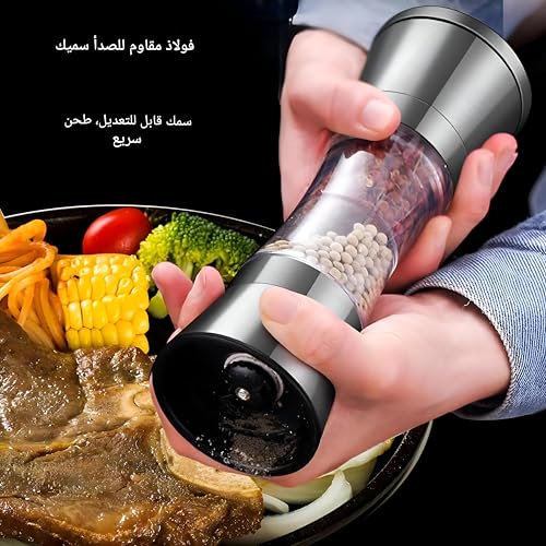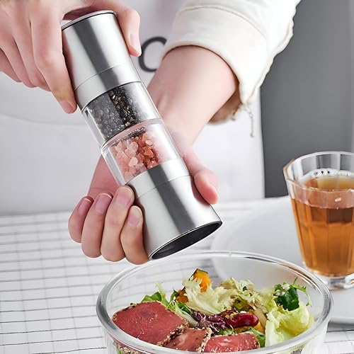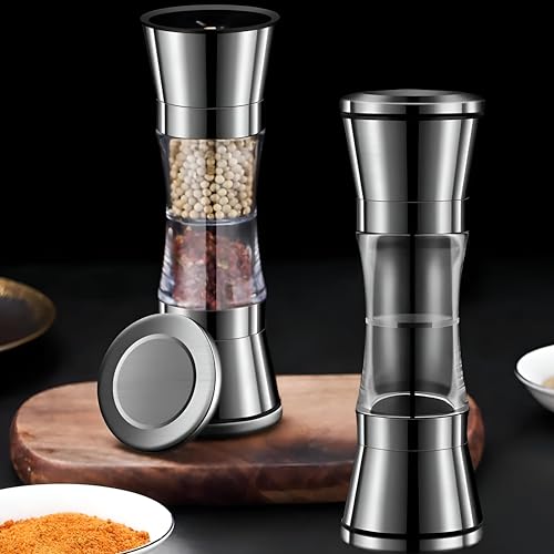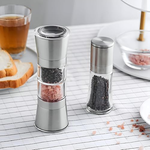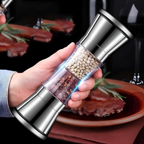 - This 2-in-1 salt and pepper grinder combines both spices into a single dual-chamber design, reducing clutter on the table and making seasoning more convenient. Its stainless steel body ensures durability, while the transparent acrylic allows easy monitoring of spice levels.