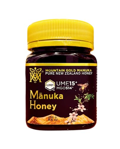 MOUNTAIN GOLD MANUKA マウンテンゴールドマヌカ - عسل مانوكا UMF15+ MGO514+ (250 جرام)، عسل مانوكا النقي، خالي من الإضافات، غير مسخن، عسل مانوكا ذهبي خام مصنوع في نيوزيلندا، تم فحص الجودة