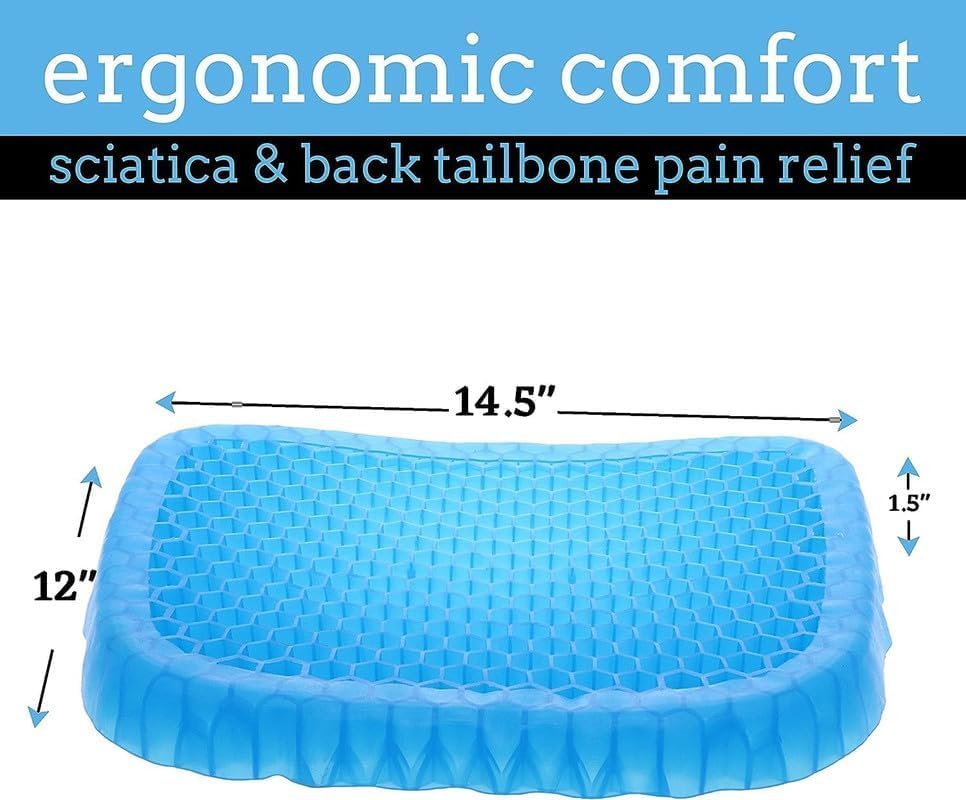 - Orthopedic Design: The cushion is made with a high-quality gel material that conforms to your body’s shape, helping to alleviate pressure on the tailbone and provide effective lumbar support. This makes it ideal for people with lower back pain or discomfort caused by extended sitting.