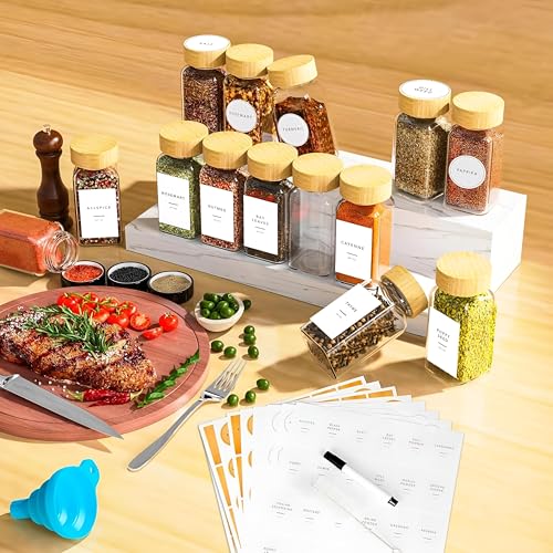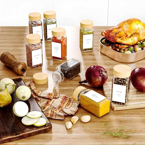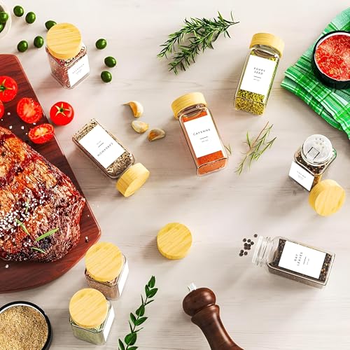 Generic - برطمانات توابل مُعلَّمة - 24 برطمانًا زجاجيًا شفافًا بأغطية خشبية، وقبعات رش، ومخروط وقلم لتنظيم المطبخ بسهولة