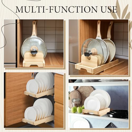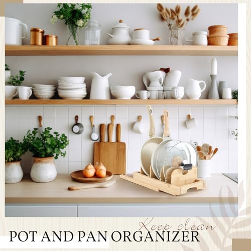 - Quality: this pot and pan organizer is crafted from quality bamboo, very durable, and good for limited spaces; Unlike wire racks, bamboo offers protection against scratches on glass lids or chrome handles, making it an nice choice for your kitchen