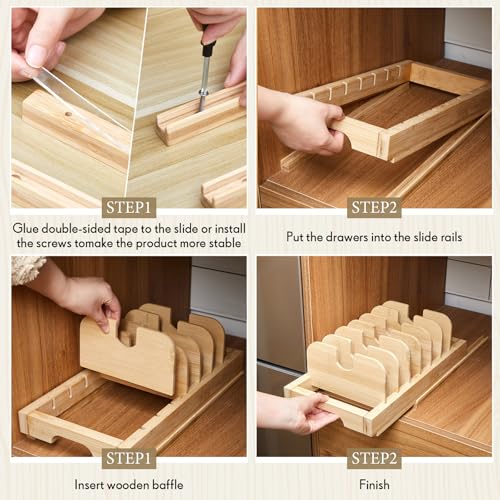 - Easy Slide-out Design: our pull-out pot lid organizer makes it easy to find and store pots and pans; The bamboo slide rail offers smooth and easy access to all items, For smoother operation, apply a layer of motor oil or polish the rail surface