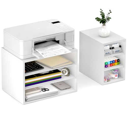 MARTY - مارتي حامل طابعة ابيض مع مساحة تخزين للمكتب كبير لسطح المكتب 6 مساحات منظم ورق خشبي ملفات للمنزل والمكتب