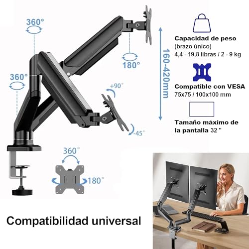 masoe - masoe Dual Monitor Stand, Height Adjustable, Table Mount, Full-Motion, Compatible with Screens 13-32 inches, Aluminum, VESA 75x75 & 100x100, for Monitors