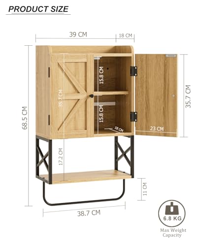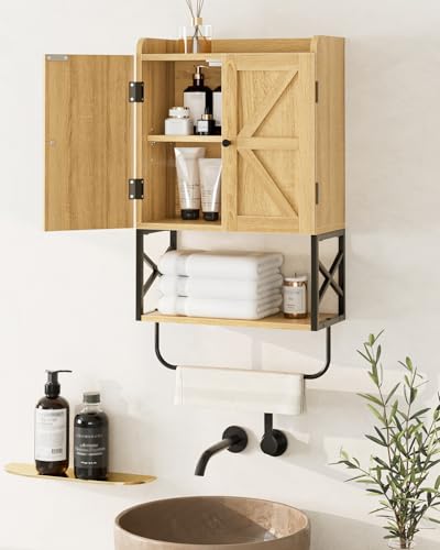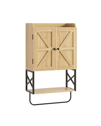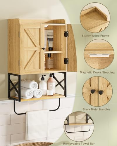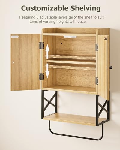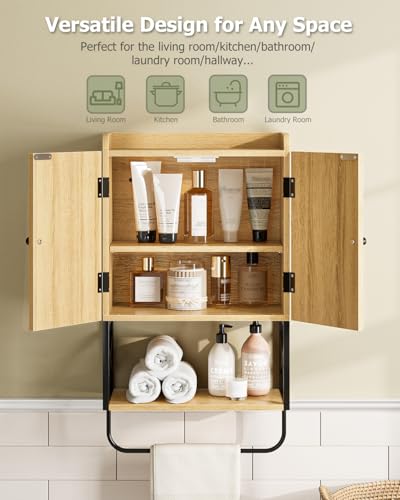 Masupu - خزانة حائط للحمام من ماسوبو، خزانة ادوية عصرية مع بابين، خزانة تخزين فوق المرحاض مع قضيب مناشف وارفف قابلة للتعديل، خزانة حمام للحمام وغرفة المعيشة (بلوط)