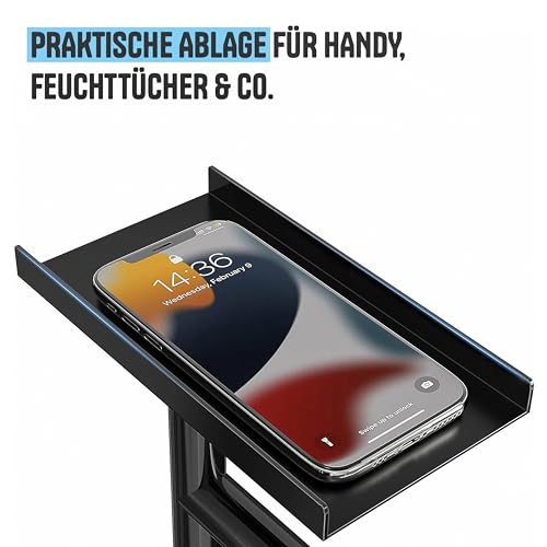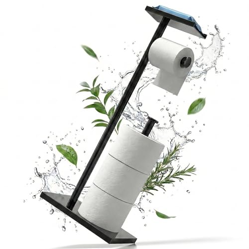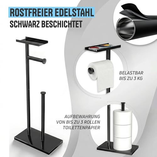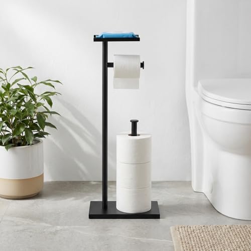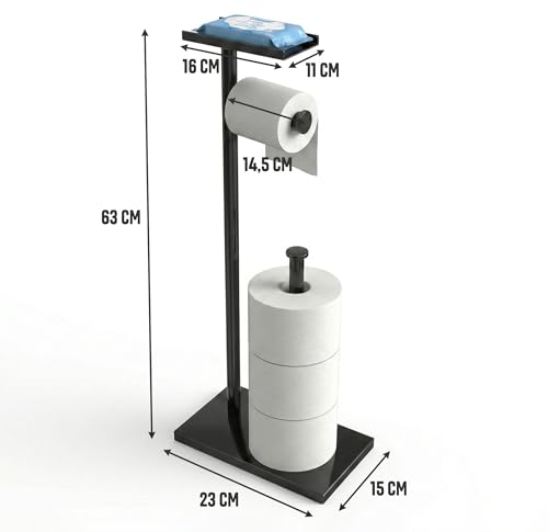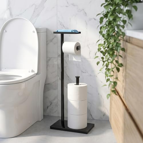 MATERIUM - MATERIUM Standing Toilet Paper Holder, Black, with Shelf, Extra Heavy Base, Standing Toilet Paper Holder, Freestanding, Floorstanding, with Storage Compartment (Black)