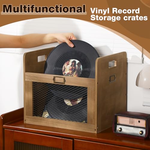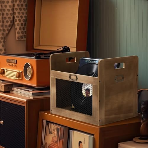 Maxdot - ماكسدوت صندوق تخزين اسطوانات الفينيل، صناديق تخزين شبكية خشبية ومعدنية متعددة الوظائف مع مقبض، منظم مكعب لتخزين ما يصل الى 80 سجل فينيل ال بي، عبوتان