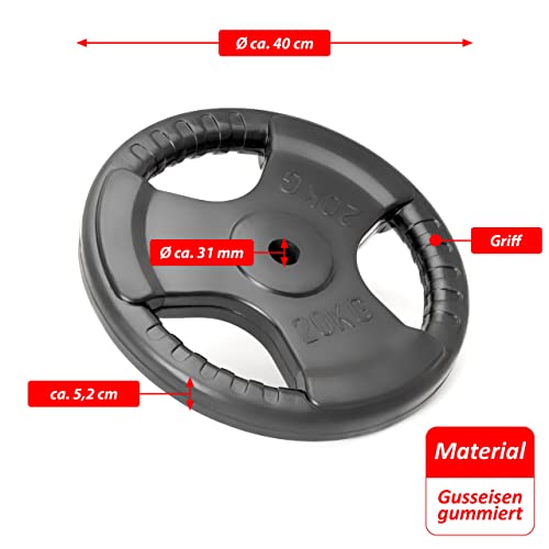 - With a hole diameter of 30/31 mm, the 20 kg heavy discs have a standard size and therefore fit all standard dumbbell bars with a diameter of 30 mm. This prevents slipping or rattling during training.