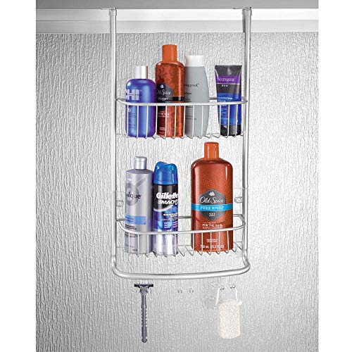 mDesign - mDesign Hanging Shower Storage - Mounting No Drilling Stainless Metal Shower Shelf - 2 Shower Baskets with 6 Hooks and Towel Holder for Shower Accessories - Silver