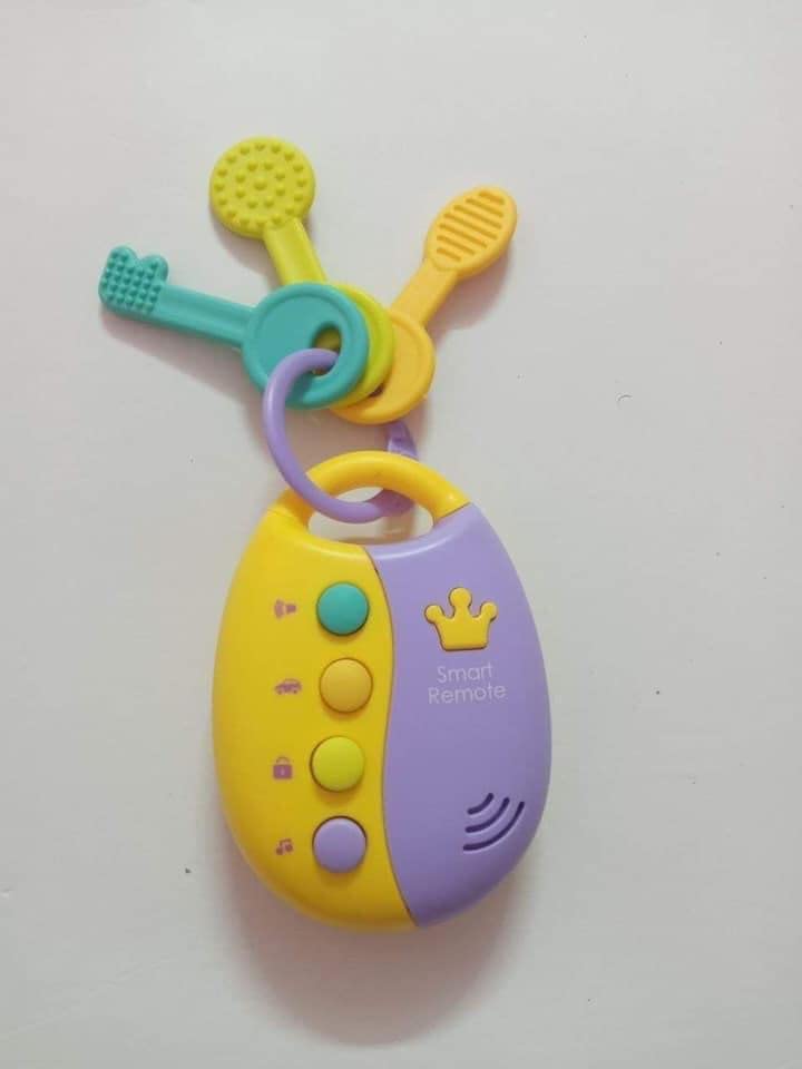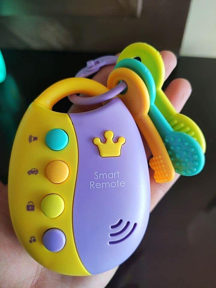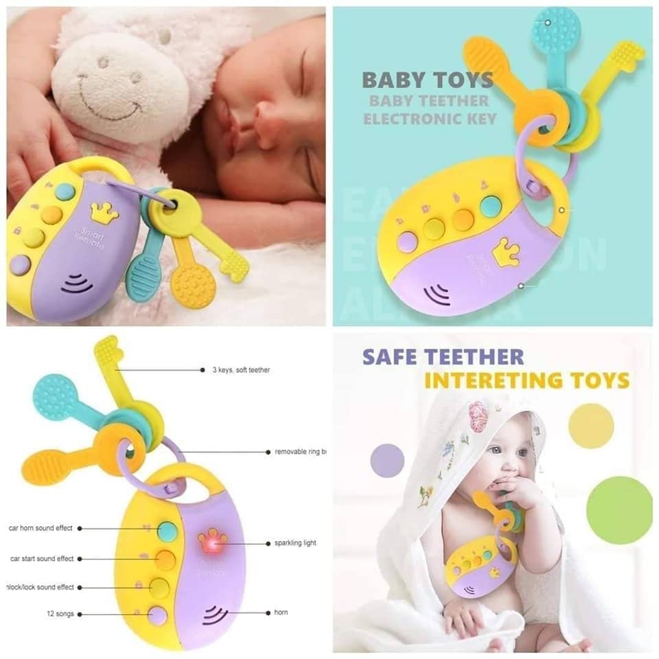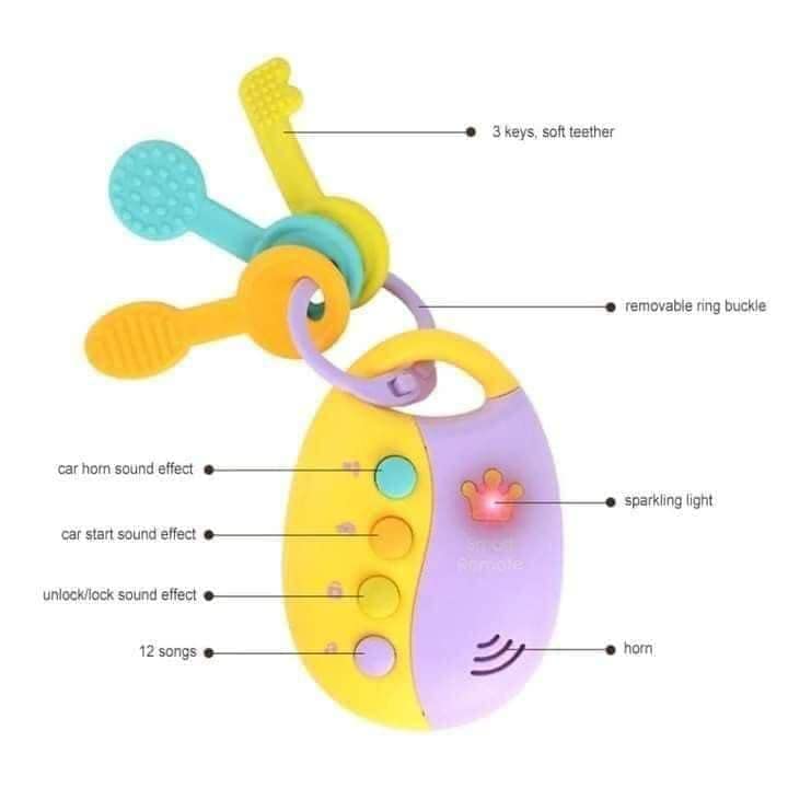 - 3 قطع مفاتيح سيارة للاطفال من السيليكون الطبي مع جهاز تحكم عن بُعد مزود بـ 12 نغمة انذار وتأثيرات موسيقية اخرى للسيارة