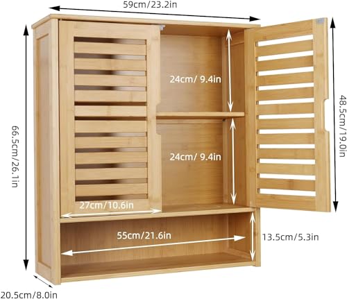 - Spacious storage space - With 23.2 x 8 x 26.1 inches overall dimension, this bamboo wall cabinet has 2 tier upper shelf and a wide open bottom shelf which provide you with enough storage space for bathroom essentials, kitchen utensils set, or daily necessities