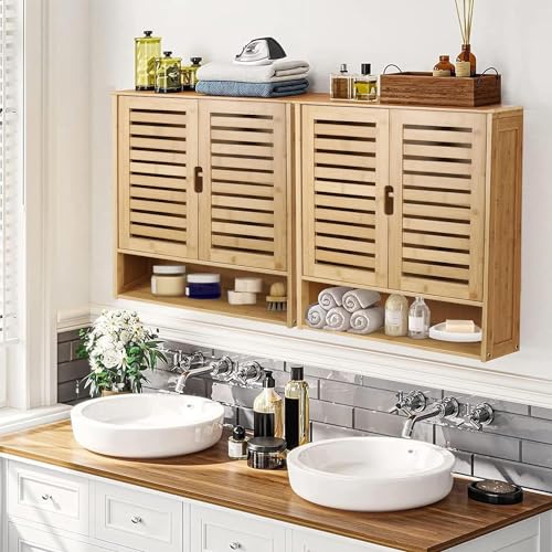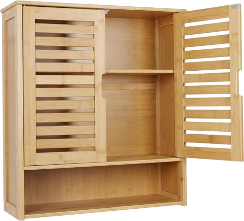 medla - Bathroom Wall Cabinet Storage: Bamboo Medicine Cabinets Wall Mounted Shelves Over Toilet Storage Organizer with 2 Doors Adjustable Shelf Magnetic Lock
