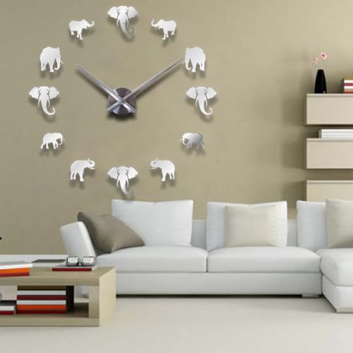 MEELA - ساعة حائط كبيرة من ميلا يمكنك تركيبها بنفسك بدون إطار بسطح مراية لغرفة المعيشة والمنزل والمكتب ملصقات تزيين (LXL029-فضي)