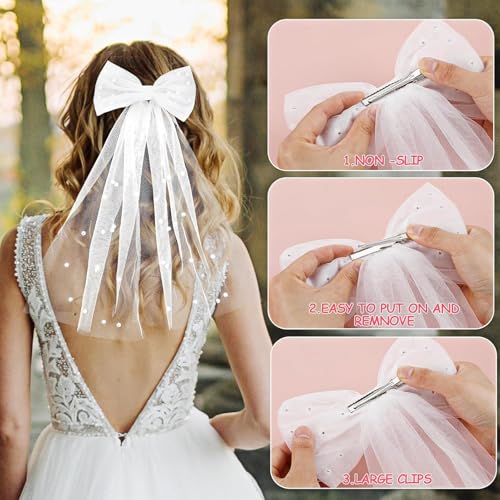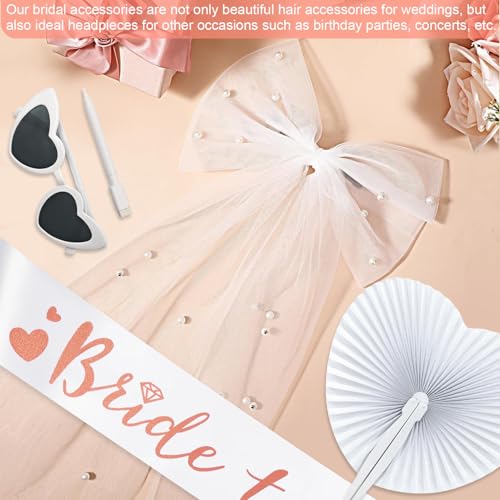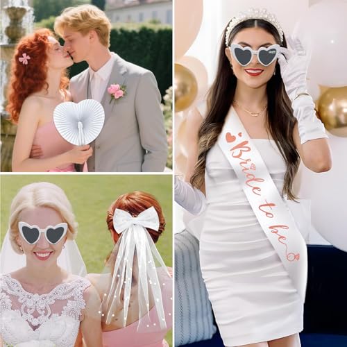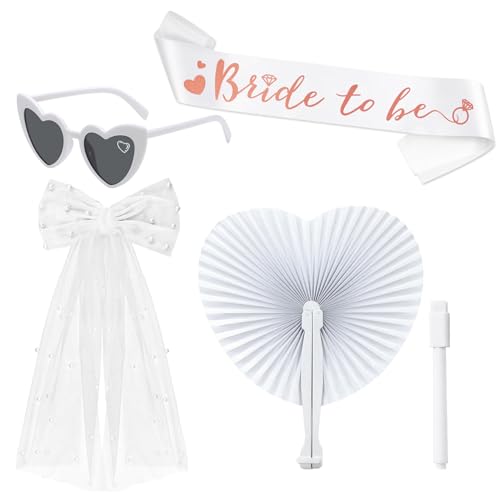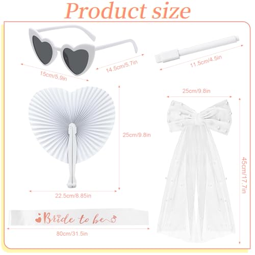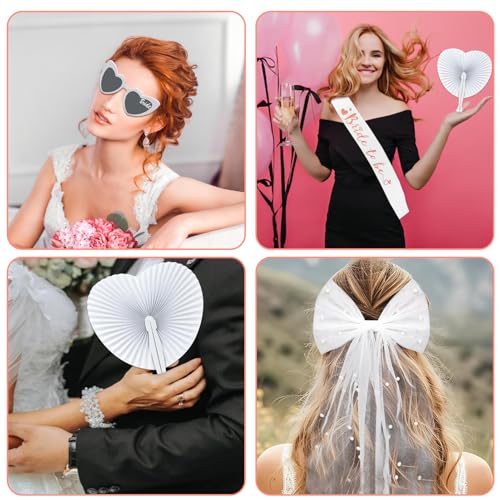 Meemion - Wedding Fan Bride to Be Sash, Veil JGA White, Heart Sunglasses with Pen, Pack of 5 Hen Party Accessories Women, Hen Party Decoration Women for Bachelor Party, Bridal Shower and Wedding