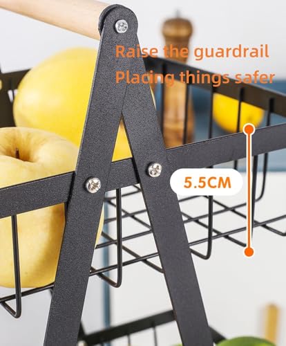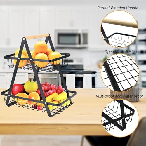 MEESOGA - 2-Tier Fruit Basket Stand with Wooden Handle - Fruit Bowl Holder Bread Basket Vegetable Rack, Detachable Metal Fruit Holder for Fruit Vegetables Snacks for Home Kitchen Office