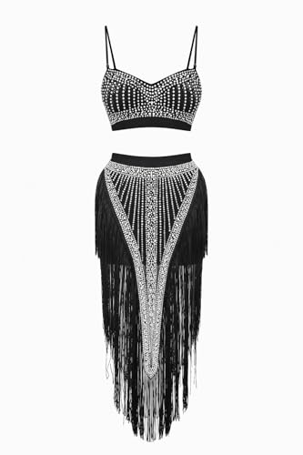 Generic - Memo طقم حريمي قطعتين، أسود، مزين بفصوص لامعة وشراريب، توب قصير مع جيبة سهرات، للمناسبات الخاصة
