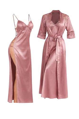 Generic - memo Women's Satin Light Cashmere 2 Piece Lingerie Set (Nightdress + Robe) Elegant Lace Design Side Slit Home Evening Dress 85 to 90 KG
