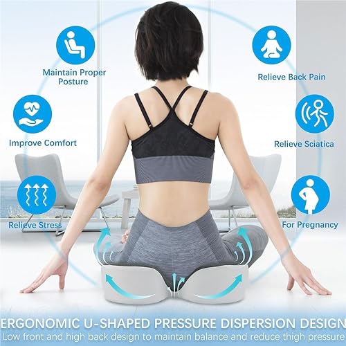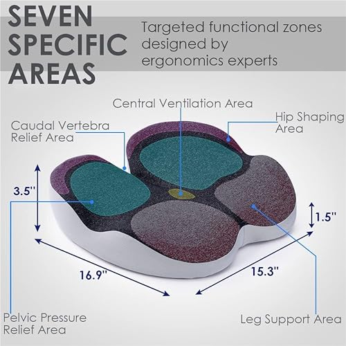 - Ergonomic Office Chair Cushion. Our cushions have a scientific zone design - high in front and low in the back. When you sit down, it immediately wraps around your hips, giving your hips and thighs support, redistributing your lower body weight for comfort even during long hours of sitting. The ergonomic design helps to increase blood flow, prevents pain in the lower back and tailbone, and relieves muscle fatigue. It allows you to sit upright naturally without pain.