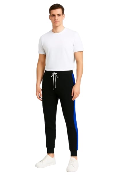 Perfect Fashion - Men's Athletic Jogger Sweatpants with Side Stripe, Black with Blue Accent, Drawstring Waist