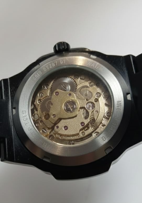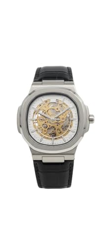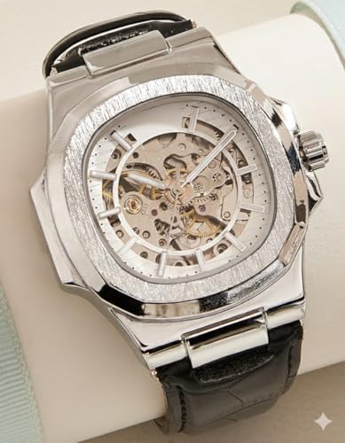 Generic - ساعة يد رجالية أوتوماتيكية بهيكل معدني، سوار جلدي أسود، قرص هيكلي شفاف بآلية ظاهرة