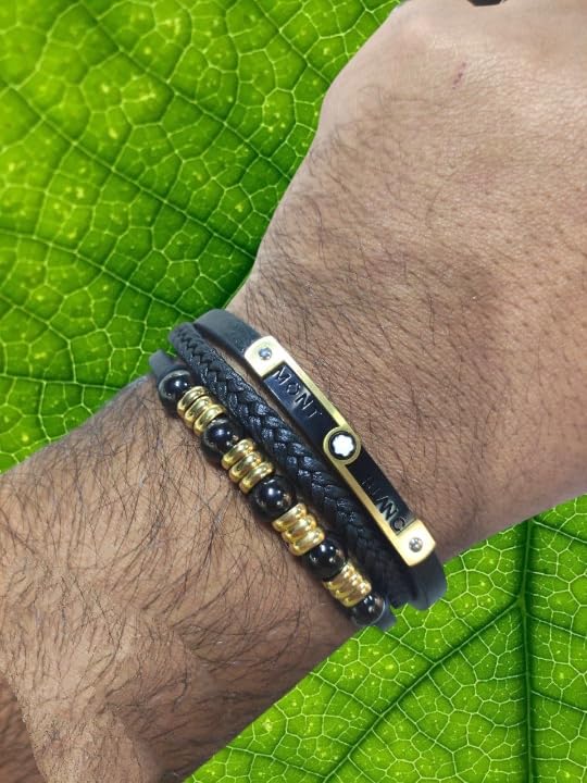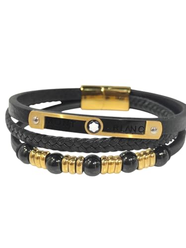 Generic - Men's Black Leather Bracelet Natural Stone Beads Magnetic Clasp Stainless Steel Bracelet