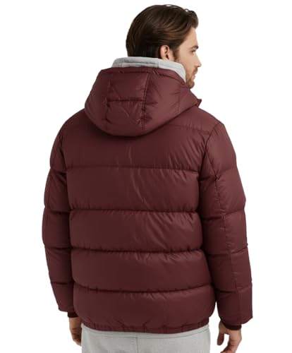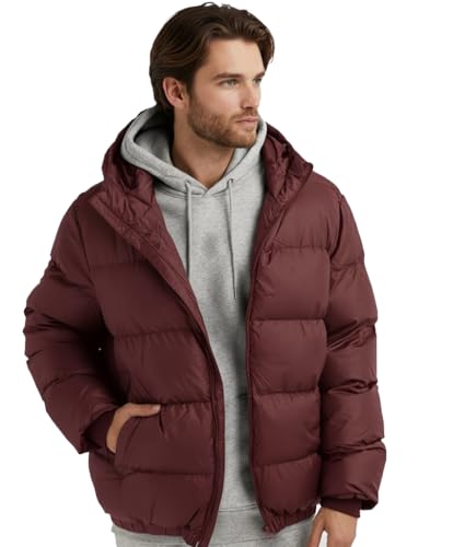 Generic - Men's Puffer Jacket, Burgundy, Quilted Design, Hooded Winter Coat, Zip Front Closure