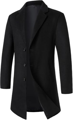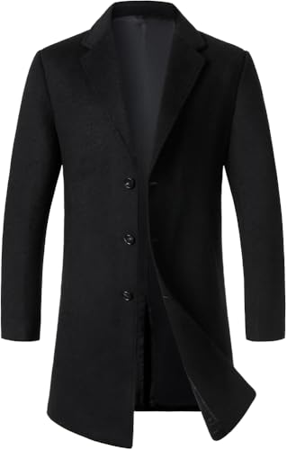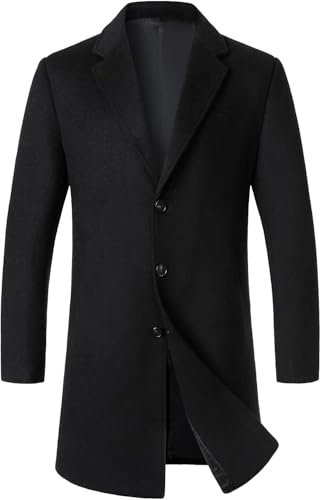 Generic - Men's Wool Blend Overcoat, Black, Single Breasted, Long Trench Coat, 3 Button Closure