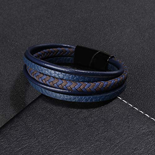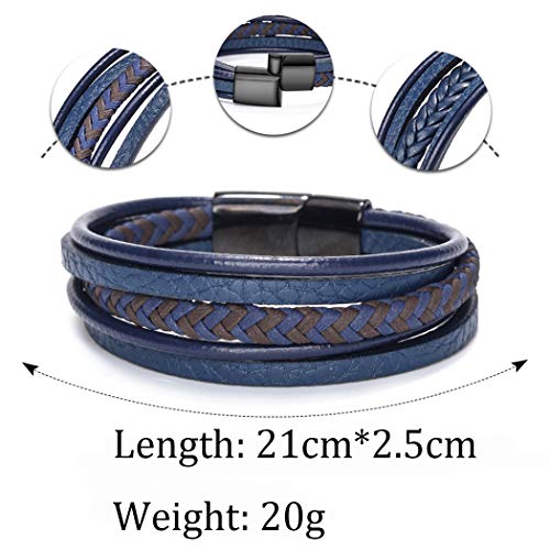 generic - سوار جلد ازرق عتيق للرجال بتصميم بوهو من جلد البقر المضفر متعدد الطبقات، سوار معصم مجوهرات مع مشبك مغناطيسي من الستانلس ستيل، 7.5 انش، جلد ستانلس ستيل