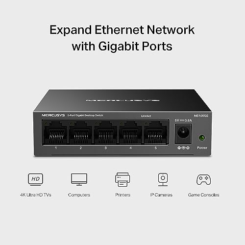 MERCUSYS - MERCUSYS 5-Port Gigabit Desktop Switch, 5× 10/100/1000Mbps Ports, Multiple Installation, Auto-Negotiation, Auto-MDI/MDIX, Power Saving, Metal case, Plug & Play, No Configuration Required (MS105GS)