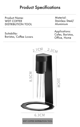 - Food-Grade Materials - Crafted from premium, food-safe materials, our WDT Tool is designed for everyday use in both cafes and homes. The coffee stirrer features SUS304 stainless steel needles, ensuring a robust texture that resists corrosion and rust. Its all-metal stand adds durability and a touch of elegance. The thicker design enhances stability, and it can be easily rinsed with water to maintain cleanliness and order.