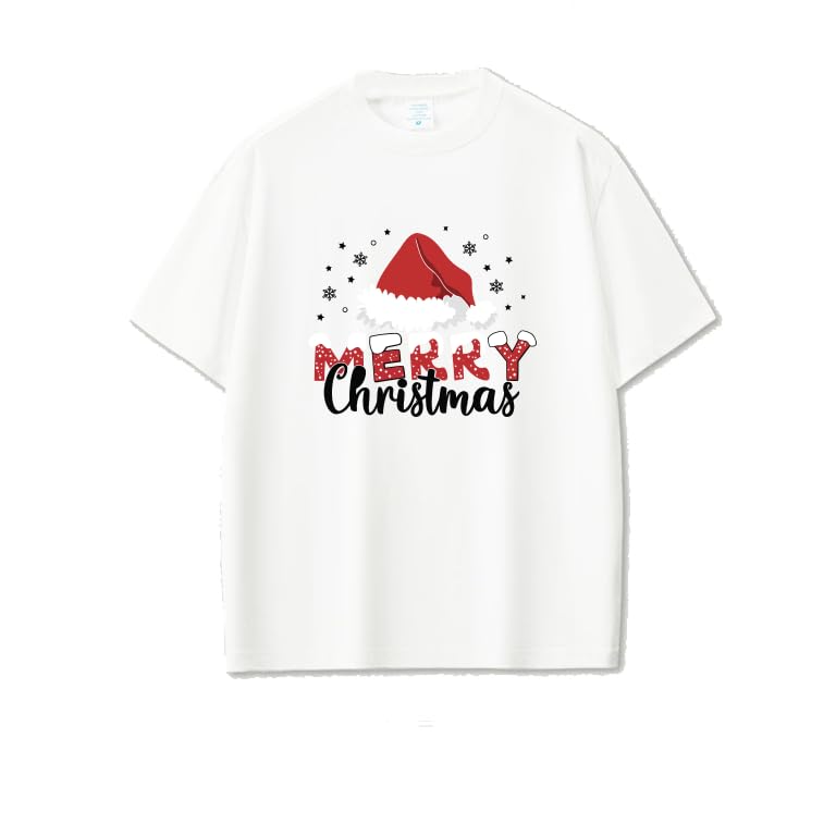 Generic - Merry Christmas T-Shirt, White Cotton Holiday Tee with Santa Hat Design, Festive Winter Snowflake Pattern Size (9-12Y)