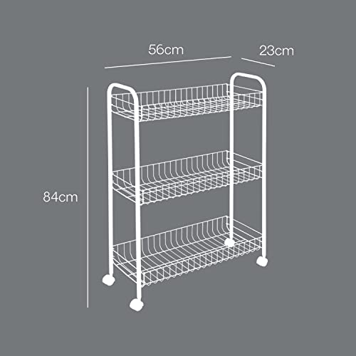 - SPACE-SAVING ORGANISER: Save space in your home! Our 3-tier rolling trolley with wheels is the perfect solution for your organisation and storage needs; This sleek storage trolley is a slim size (56 x 23 x 84 cm) to fit smaller spaces but sturdy enough to store light or heavy items, providing sufficient space for all your homeware, accessories, tools and dècor