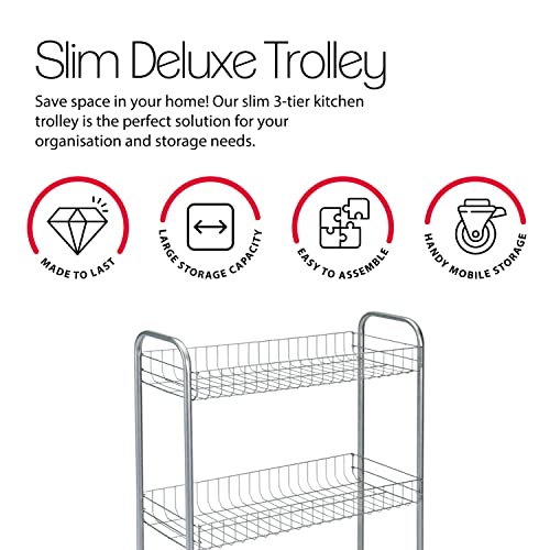- VERSATILE STORAGE TROLLEY: Our Slim Deluxe trolley on wheels is so versatile that you can use it in your kitchen, bathroom, office, garage or anywhere you need stylish storage; The rolling cart has 4 durable wheels that rotate 360°, so you can effortlessly push it in all directions even with a full load