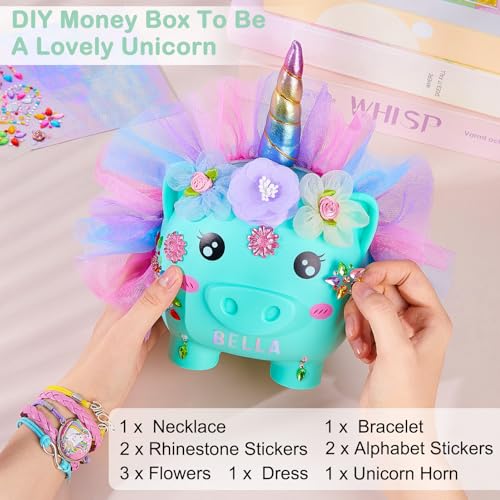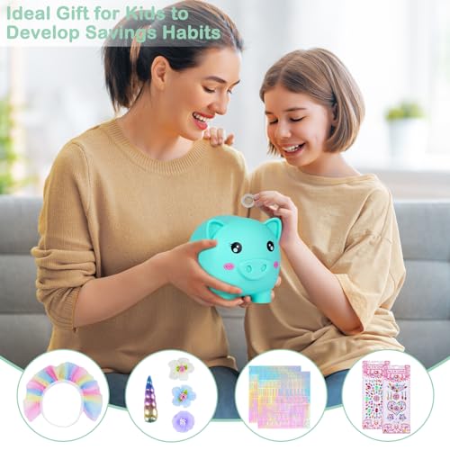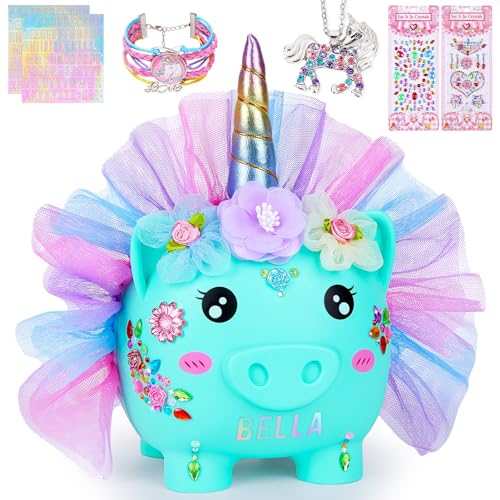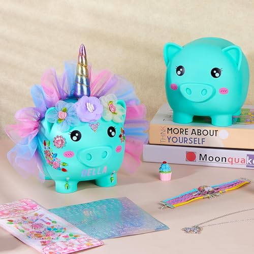 - 🎁【حصالة نقود على شكل وحيد القرن، زينة لطيفة يمكنك صنعها بنفسك】تأتي حصالة النقود اللطيفة مع ملحقات رائعة يمكنك صنعها بنفسك، ويمكن للأطفال تزيين الحصالة بقرن وحيد القرن، وفستان، وزهور، وملصقات أحجار الراين، كما تتيح لهم ملصقات الحروف الأبجدية لصق أسمائهم الشخصية على الحصالة.