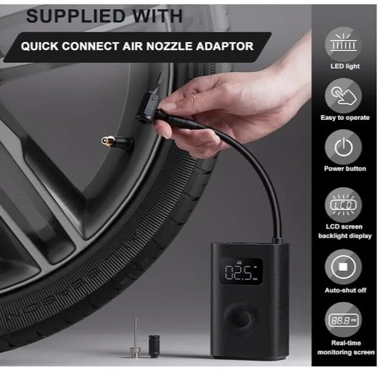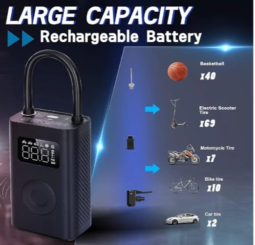 - عمر بطارية طويل - يحتوي ضاغط الهواء المحمول على بطارية ليثيوم مدمجة عالية السرعة 2000 ميلي امبير في الساعة، والتي توفر قوة تكبير. لا حاجة إلى طاقة خارجية. إنها قوية بما يكفي لنفخ 10 إطارات في سيارة الطريق ولها مغناطيس قوي يجعلها أسرع بنسبة 25%. يمكن ملء الإطارات الفارغة في 8 دقائق فقط. مع ضغط نفخ يصل إلى 150 باوند لكل انش مربع، يستغرق الأمر 86 ثانية فقط لنفخ إطارات الدراجات التي تتطلب ضغط هواء عالي.