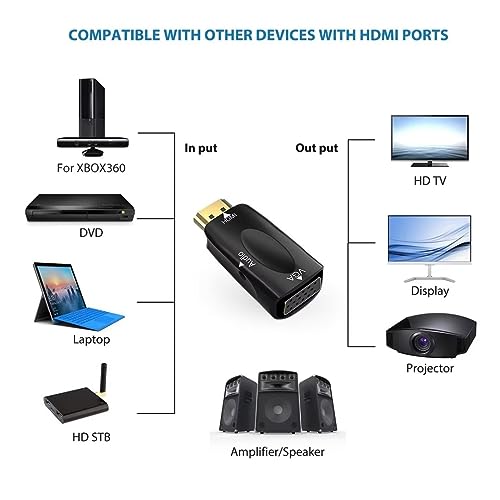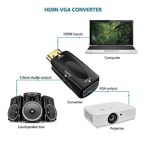 - Equipment: HDMI-VGA converter is compatible with notebook computer equipment with HDMI port. The VGA female port can be connected to projectors, monitors/displays and other devices with a VGA female port.