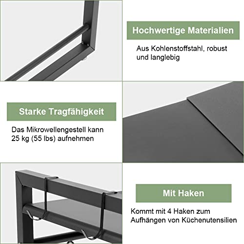 - Load 25 kg/55 lbs: the microwave rack holds up to 25 kg/55 lbs and is therefore stronger than other microwave shelves on the market. Two support bars are shrink-wrapped on both sides in the front frame. The rack is stronger enough to hold microwave and other kitchen utensils such as dishes, spices, preserves, spices, bottles, dishes, pots and pans