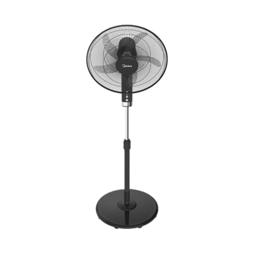 Midea - مروحة ستاند 45 سم مع جهاز تحكم عن بعد FS45-25MR-BK من ميديا، محرك نحاسي، 75 وات، تصل إلى 1300 دورة في الدقيقة، 5 شفرات متينة مقاومة للصدمات، هادئة 6% هدوء، طول قابل للتعديل، يصل إلى 1.57 م، أسود