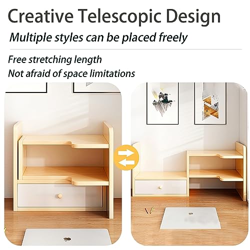 - Creative telescopic design - The lower left section (with drawers) and upper right section (3-layer bookshelf) of the desktop bookshelf can be adjusted in length to fit different desktop spaces, and even you can freely combine the two parts according to your desired way.