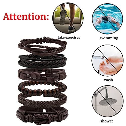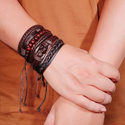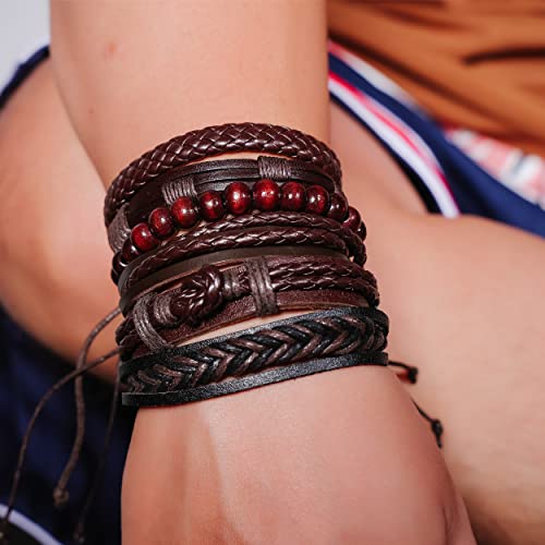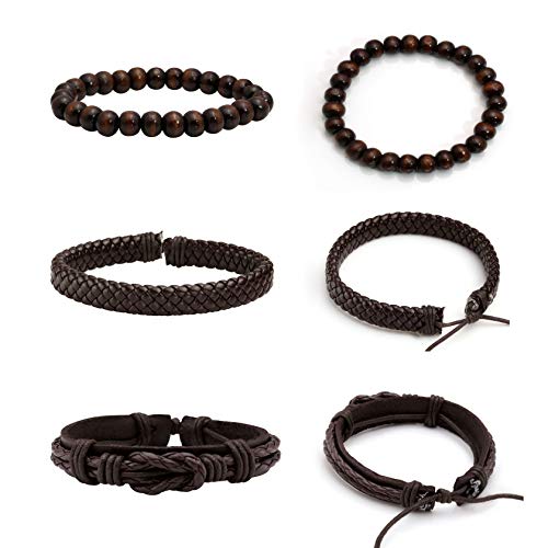 MILAKOO - MILAKOO 6 Pcs Braided Leather Bracelet for Men Women Wooden Beaded Cuff Wrap Bracelet Adjustable, 7-9.5 inches (adjustable), Leather