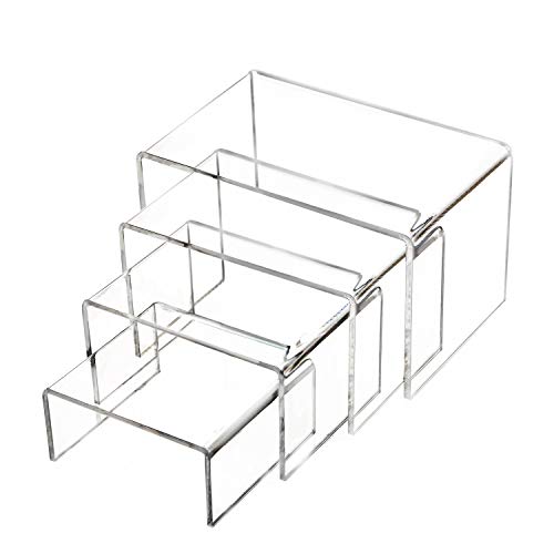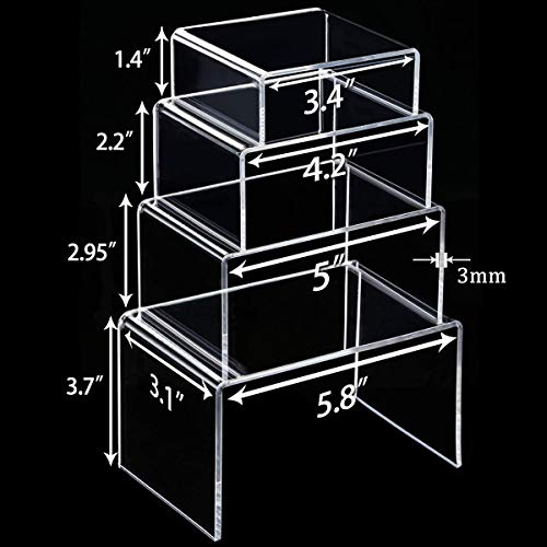 - Package includes: 4 pieces square transparent acrylic display risers in 4 different sizes: 3.4, 4.2, 5.0, 5.8 inches, small: 3.4 x 3.1 x 1.4 inches, medium: 4.2 x 3.1 x 2.2 inches, large: 5.0 x 3.1 x 2.95 inches, X-large 5.8 x 3.8 1 x 3. 7 inches.